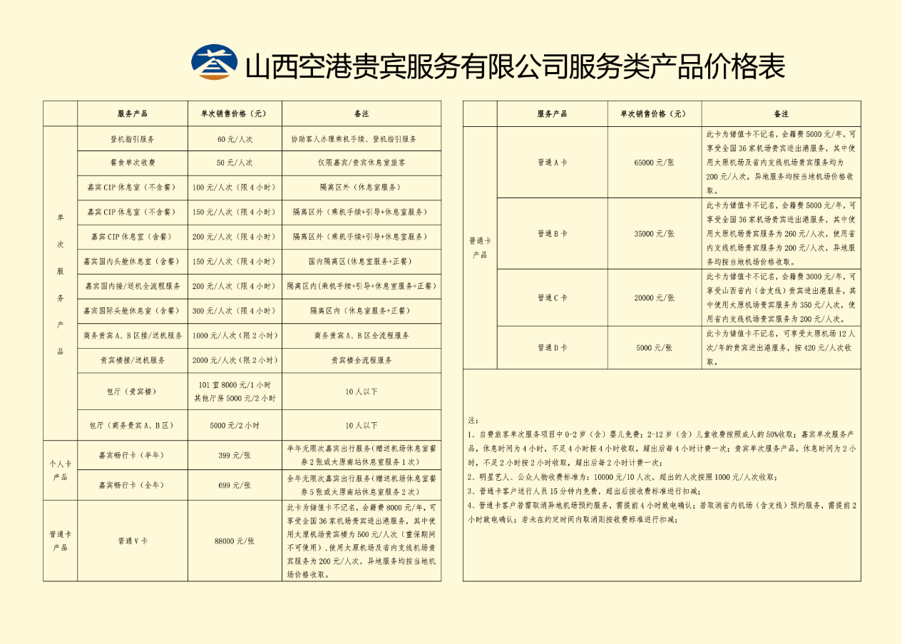 公司在太原机场拥有独立政务贵宾楼、贵宾A区、B区、嘉宾区、行李打包、山西省内各机场贵宾服务业务和专用停车场,贵宾区环境雅致,远离候机大厅的喧嚣,拥有专属通道一步登机。